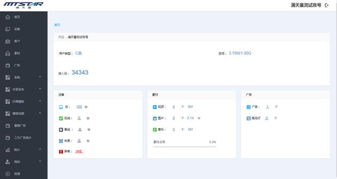 可查看后台总数据如:设备总数量,在线终端数量,离线终端数量,素材数量及占用空间,广告节目数量等;