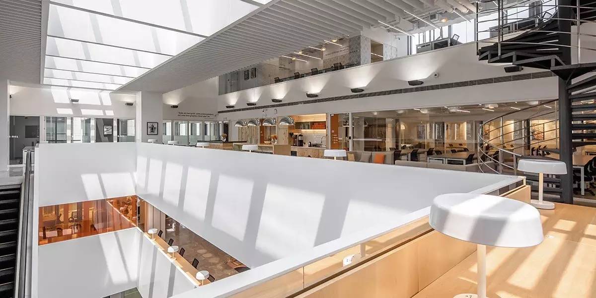 E楼3Q的设计中将色彩运用回归到相对温和的色系中,并着重体现暖色的亲近感。不仅如此,团队还为3Q引入了一个全新的固定家具模块类型——狭长的“公共空间”共享办公桌,将整个中庭的视野一览无余。