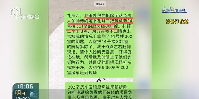 设计师 徐志旺:我们是找了外面的拆旧团队,要拆一家橱柜,我们给了他地址门牌号,拆除的(余某)队伍走错了,就跑到芳草苑14号楼302,把他们家给拆了。