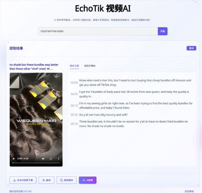 2、接下来可以测试获取到可用的素材脚本,并且通过扒同行素材来补TIKTOK.AI生成的脚本内容测试,然后就可以得到最终的脚本。
