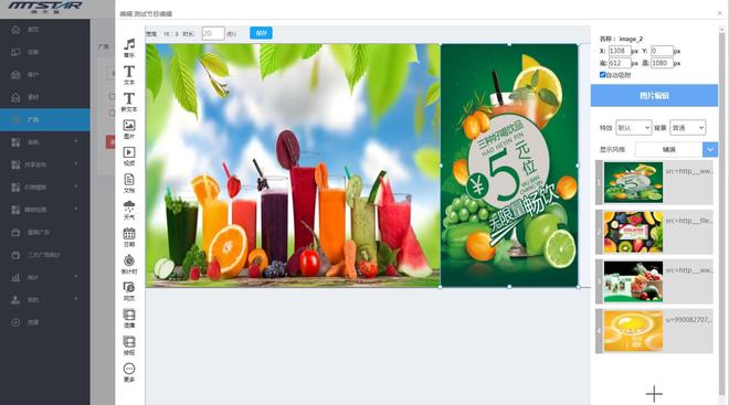 上图为制作节目界面,左侧为添加素材模块,选择到模板内,可任意拖动大小和位置,设置播放时间、顺序、样式等。