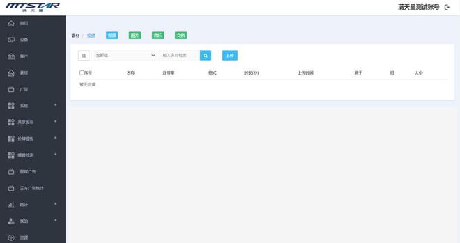 将需要发布素材先上传在素材库里,可分类管理,更改素材名称,预览素材,删除等操作。可上传素材为图片、音视频、PDF文档等;